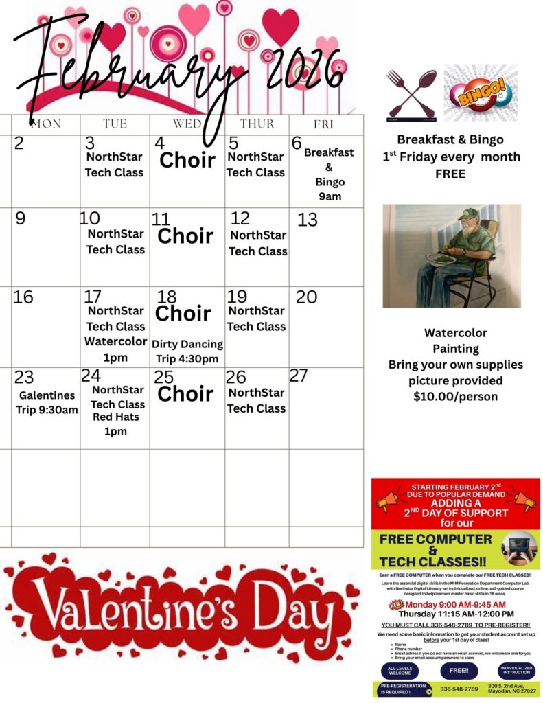 If you are interested, Contact: Denise Hicks: Senior Center Coordinator dhicksmmrec@gmail.com or call (336)548-2789 or (336)548-9572 Hours: Monday-Friday: 8:30 am to 5:30 pm