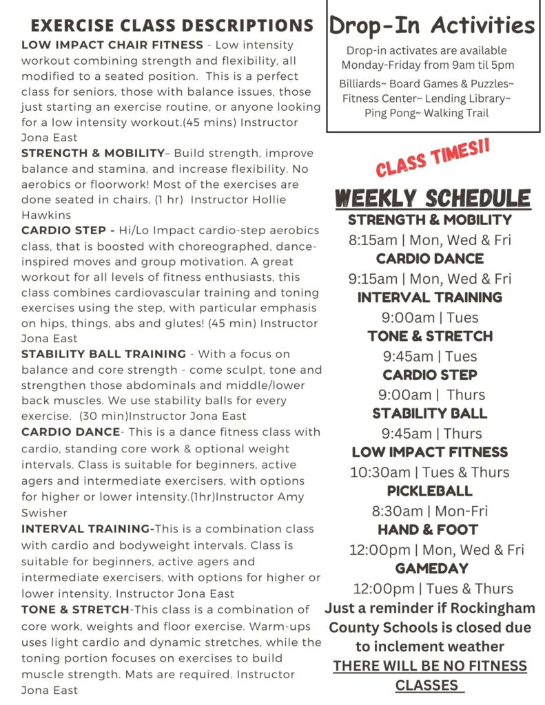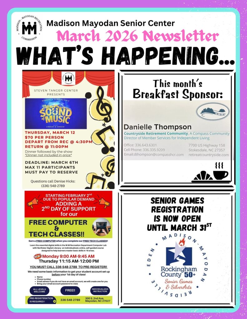 BREAKFAST CLUB – Provides social interaction, speakers with information on resources & a delicious breakfast. Sponsored by the Madison-Mayodan Rotary Club. Day/Time: 1st Friday of each month/9:00am. Fee: FREE BINGO – Socialization & friendly competition with prizes awarded. Maintain mental skills & hand-eye coordination. 1st Friday of each month|9:30am. Fee:…