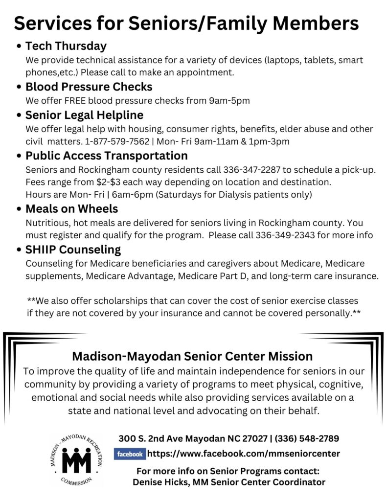 The Madison-Mayodan Senior Center strives to provide resources and activities to aid seniors, aged 50 or better, in maintaining an independent lifestyle and remaining involved in the community.